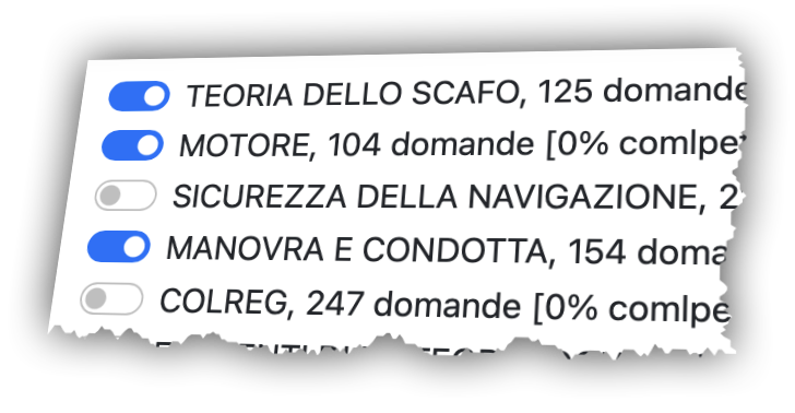 Seleziona i temi con cui vuoi fare pratica. Focalizzati su i temi più complessi. Combina i filtri con la modalità "solo errori" per esercitarti solo con le domande più fastidiose.