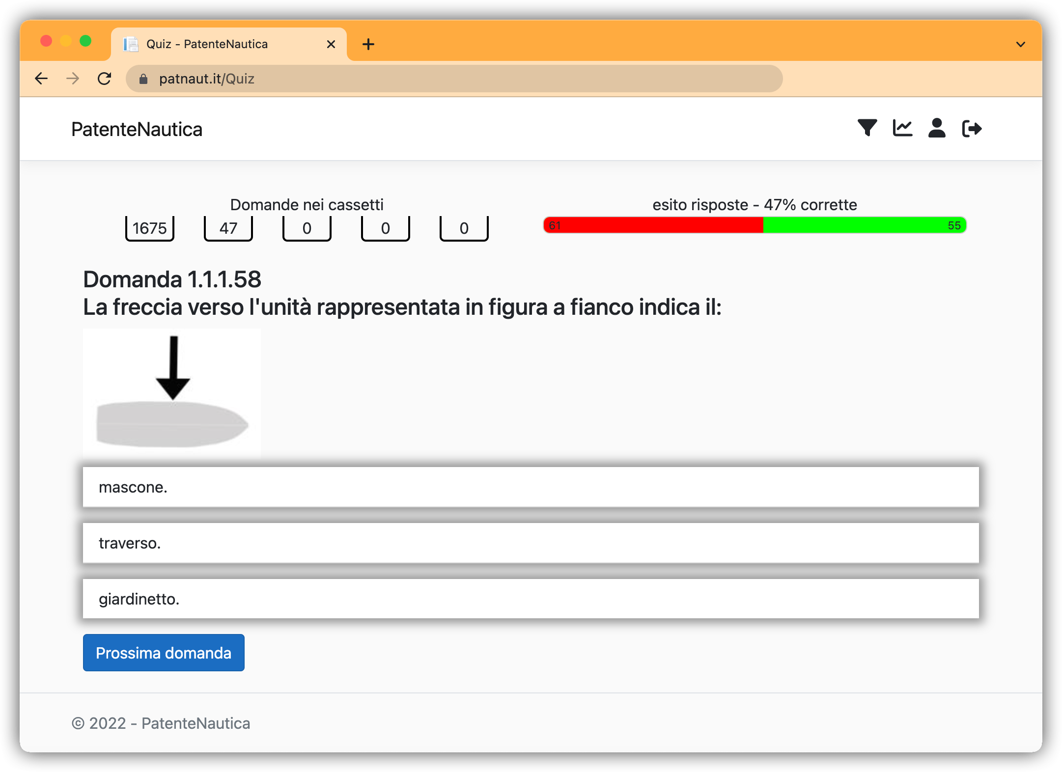 I cassetti evitano di ripetere domande già note. Le domande con risposta corretta avanzano di cassetto. Le domande con risposta errata tornano al cassetto precedente. In questo modo, l'applicazione presenta più frequentemente le domande con cui hai difficoltà e meno frequentemente quelle che conosci già.